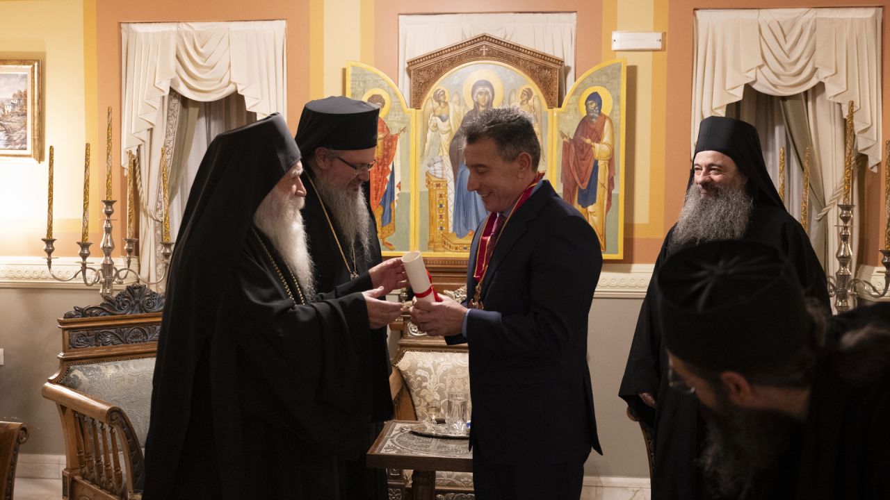 Σε κλίμα συγκίνησης και ευλάβειας, ο Δημήτρης Χριστοφιλέας, ιδιοκτήτης του Δειπνοσοφιστήριον, τιμήθηκε από τον ηγούμενο της Μονής Ξενοφώντος Αγίου Όρους, με τον Μεγαλόσταυρο του Αγίου Μεγαλομάρτυρος Γεωργίου, ο οποίος είναι και ο προστάτης του μοναστηριού.