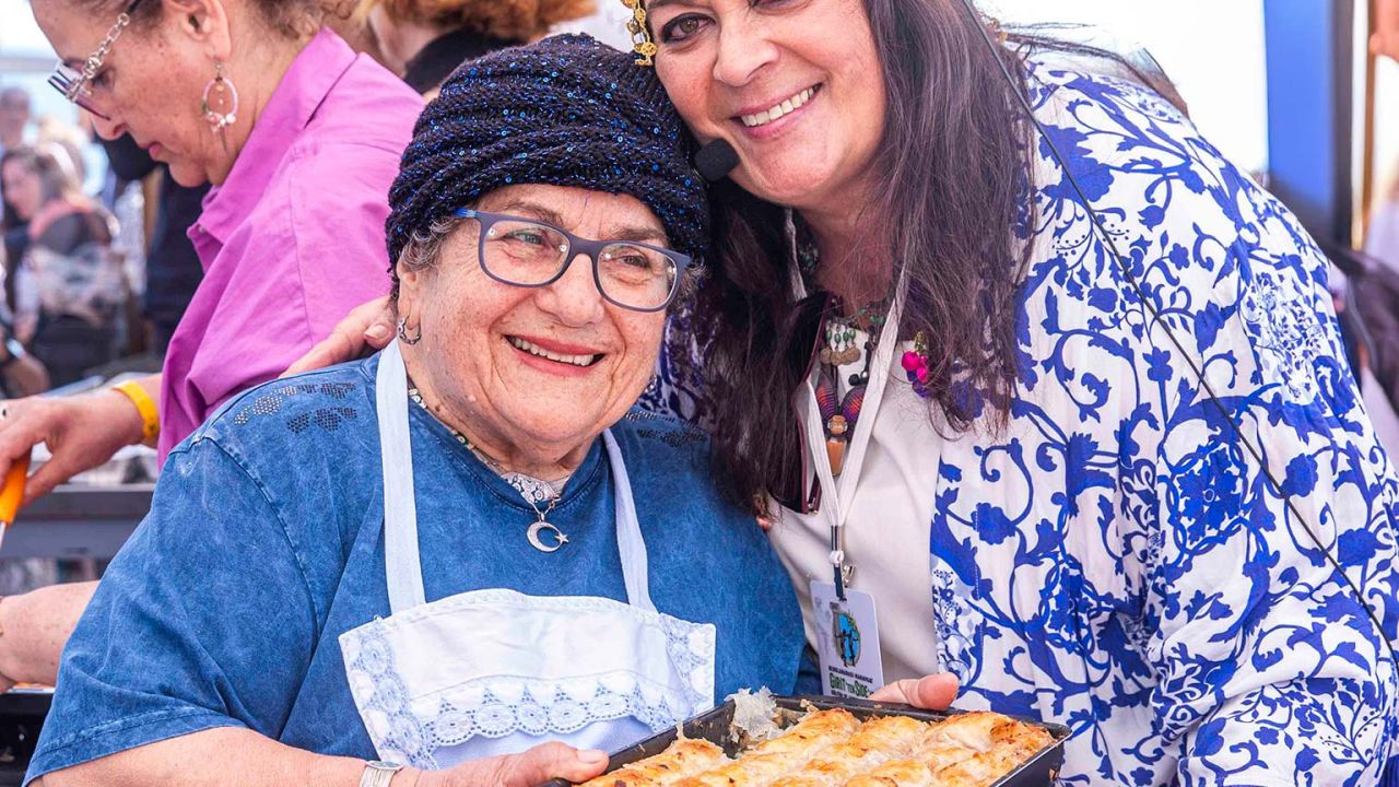 Ο Πασχάλης Αφθονίδης και η Μαρία Εκμεκτσίογλου με γυναίκες της Σίδης, κατά τη διάρκεια των μαγειρικών παρουσιάσεων.