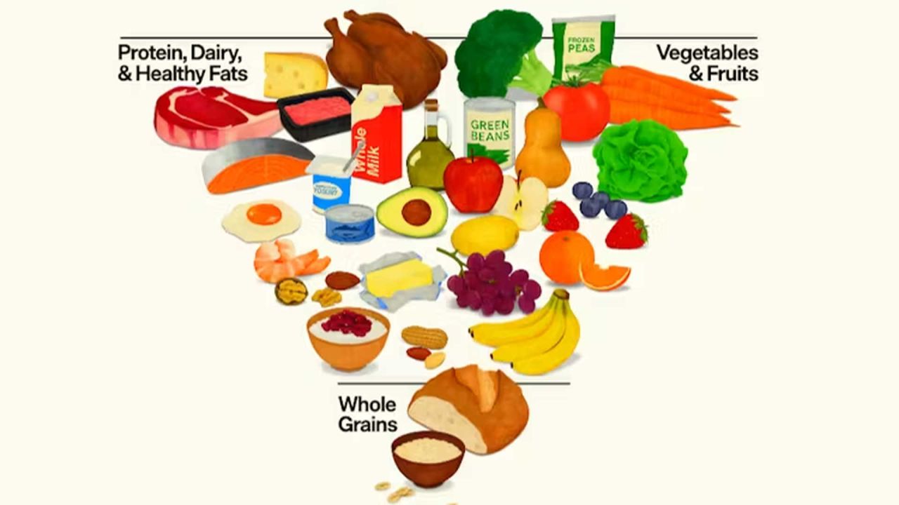 Σε αυτό το νέο μοντέλο, η πρωτεΐνη, τα γαλακτοκομικά και τα καλά λιπαρά βρίσκονται στην κορυφή, δίνοντας μεγαλύτερη έμφαση σε αυτά από ό,τι στο παρελθόν. Τα φρούτα και τα λαχανικά παραμένουν σημαντικά, ενώ τα δημητριακά, ιδίως τα επεξεργασμένα, και οι απλοί υδατάνθρακες έχουν υποβαθμιστεί.