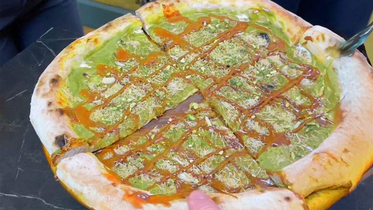Στη ζύμη μίας κατά τα άλλα κανονικής πίτσας, απλώνει πραλίνα φιστικιού, φύλλα από κανταΐφι και λιωμένη σοκολάτα.
