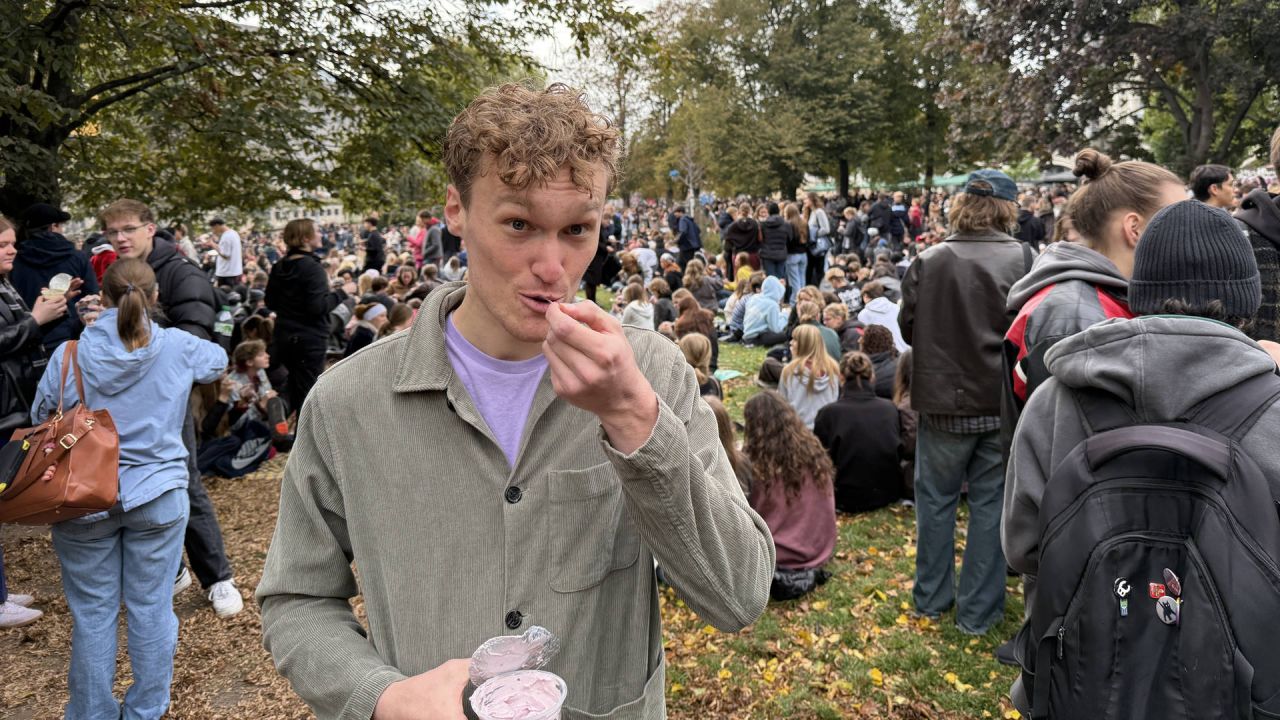«Είχα FOMO», λέει η 22χρονη Γιέτε Μ., μιλώντας γερμανικά αλλά χρησιμοποιώντας τη διεθνή αγγλική συντομογραφία για το “fear of missing out” (φόβος μήπως χάσεις κάτι, σε κοινωνικό επίπεδο), ενώ έτρωγε τη σοκολατένια πουτίγκα της με πιρούνι. Η ίδια πήγε στο James Simon Park, στη βόρεια όχθη του ποταμού Σπρέε στο κέντρο του Βερολίνου, ακολουθώντας ένα κάλεσμα στο TikTok. «Φοβήθηκα μήπως το χάσω, γιατί το βρήκα αστείο», αναφέρει.