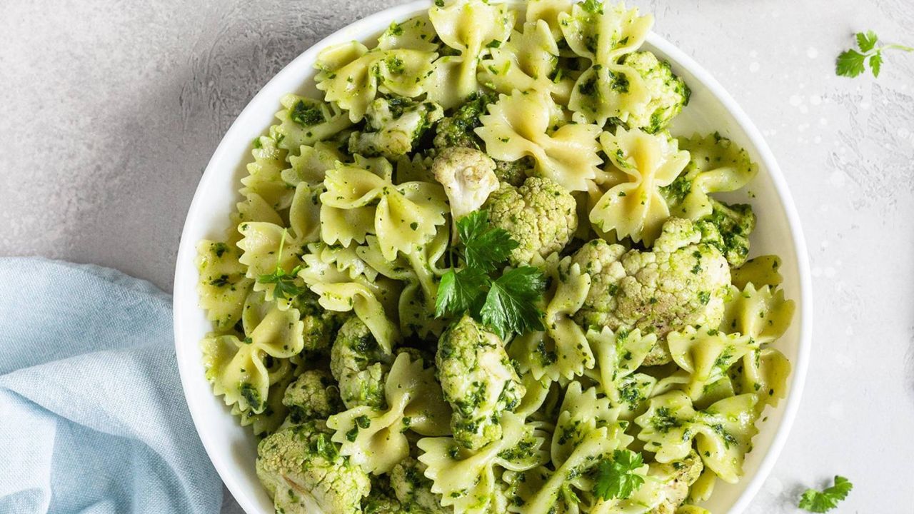 Μια πρωτότυπη μακαρονάδα με φιογκάκια, καβουρδισμένο κουνουπίδι και αρωματική, πράσινη σάλτσα με σπανάκι και βασιλικό.