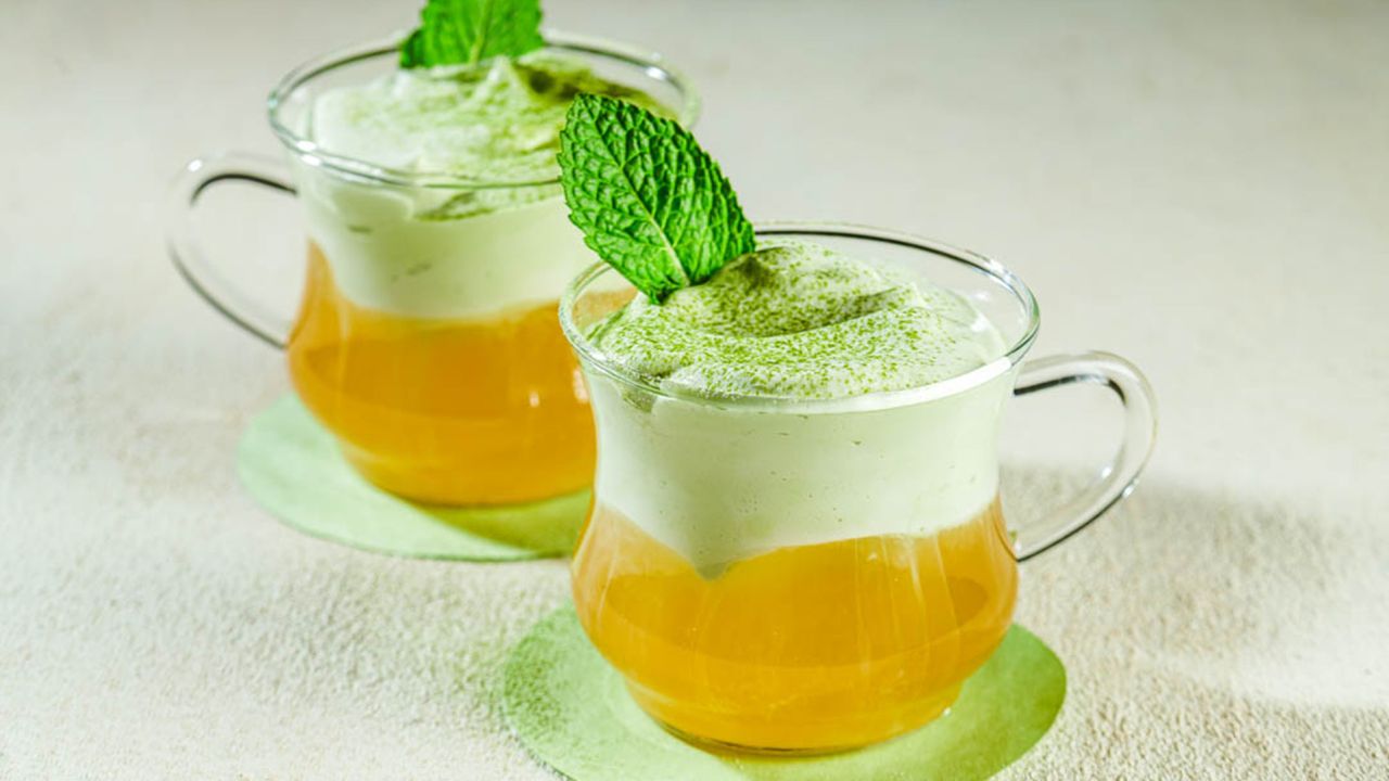 Η συνταγή σου δίνει 4 φλιτζάνια και το αρωματισμένο τζιν μπορεί να ετοιμαστεί και να διατηρηθεί στο ψυγείο έως και 1 εβδομάδα νωρίτερα, ενώ η κρέμα matcha μπορεί να προετοιμαστεί και να φυλαχθεί χωριστά 1 ημέρα πριν. Όσο για τη γλυκιά σκόνη matcha μπορείς να τη βρεις σε καταστήματα με ασιατικά προϊόντα, με είδη τσαγιού και μπαχαρικά, καθώς και online. Πράσινο τσάι με δυόσμο θα βρεις εύκολα ακόμη και στα σούπερ μάρκετ.