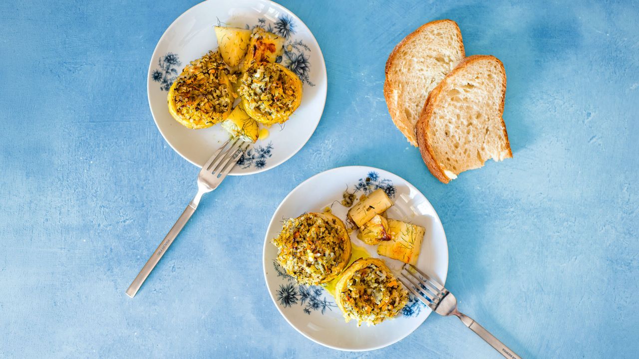 Το ρύζι στη γέμιση απορροφά τα υγρά και όλα τα αρώματα από το κρεμμύδι, τα μυρωδικά, το κρασί και το λεμόνι, ενώ οι αγκινάρες ψήνονται αργά, γίνονται τρυφερές, χωρίς να χάνουν τον χαρακτήρα τους.