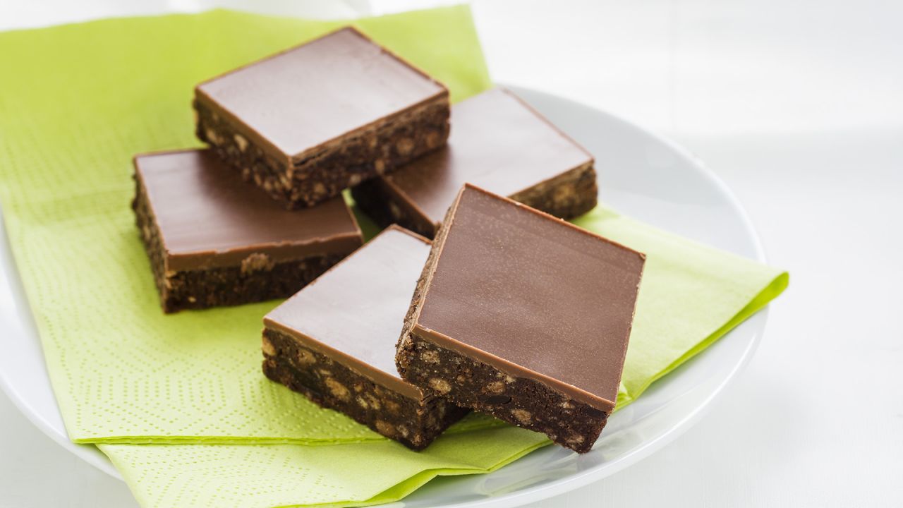 1. Για το σοκολατένιο tiffin με κουλουράκια και σταφίδες στρώνουμε ένα μικρό ταψάκι ή φόρμα διαστάσεων περίπου 20×20 εκ. με αντικολλητικό χαρτί ψησίματος.