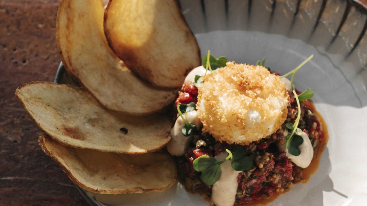 Ξεκινήσαμε με ένα απολαυστικό ταρτάρ μόσχου, εμπλουτισμένο με ντούγια (nduja) - ένα ιδιαίτερο ιταλικό και πικάντικο αλλαντικό που φτιάχνεται από περισσεύματα κομματιών του χοίρου, που προορίζεται για προσούτο ή βραστό ζαμπόν - και πίκλα μουστάρδας. Στο κέντρο του φιλοξενεί ένα παστεριωμένο κρόκο αυγού τηγανισμένο μέσα σε τραγανή κρούστα, που πρέπει να σπάσεις για να χυθεί έξω η πορτοκαλί καρδιά του, πριν το απολαύσεις. Στολίζεται με φύλλα μουστάρδας και συνοδεύεται από μεγάλα τσιπς πατάτας, για να το πιάνεις και να το χαίρεσαι με την ψυχή σου.