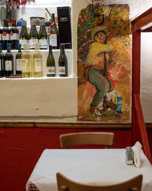 Στην αρχή, το μαγαζί ήταν μόνο ο υπόγειος χώρος που συναντάς φτάνοντας στο ιστορικό κέντρο. Κατεβαίνεις τα σκαλιά και νιώθεις σαν να μπαίνεις σε χρονομηχανή. Το πρώτο πράγμα που τραβά την προσοχή είναι η τοιχογραφία στον απέναντι τοίχο, έργο του λαϊκού ζωγράφου Γιώργου Σαββάκη.
