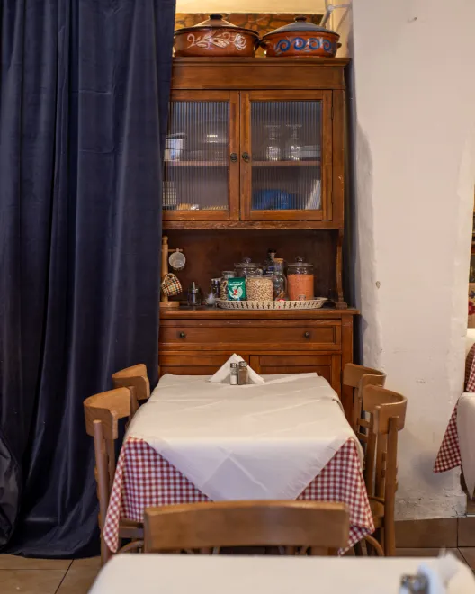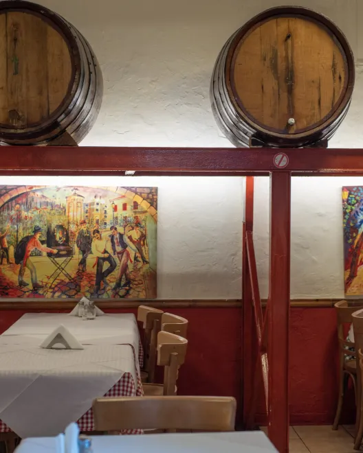 Στα τραπεζάκια του υπογείου, στρωμένα με καρό τραπεζομάντιλα, ανάμεσα στις τοιχογραφίες, θα δεις παλιά βαρέλια κρασιού που έχουν μείνει από άλλη εποχή, αλλά και ένα ψυγείο από τη δεκαετία του ’60 που λειτουργεί ακόμη κανονικά - μια μικρή υπενθύμιση πως ό,τι φροντίζεται, αντέχει στον χρόνο.