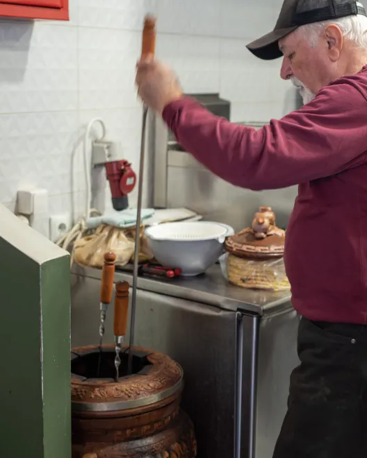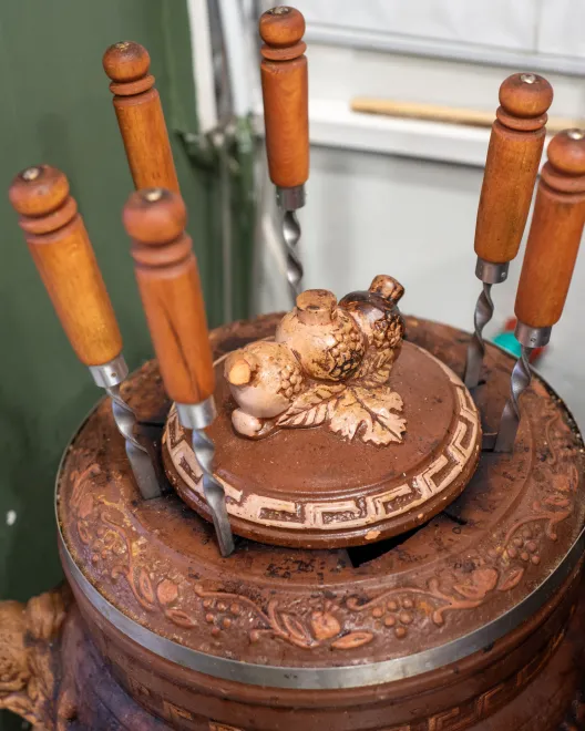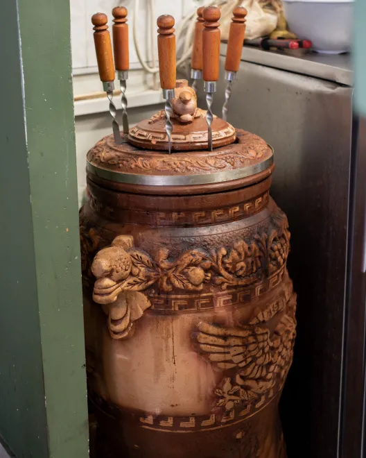 Όμως τίποτα δεν θα κατάφερνε χωρίς τη βοήθεια και τη στήριξη του σύντροφού της Στέλιου Κοπανάκη, του Στέλιου της, όπως επιμένει να λέει σαν ρεφρέν σε κάθε πρότασή της, ο οποίος μεταξύ άλλων ζυμώνει και ψήνει τα εξαιρετικά κεμπάμπ που σερβίρουν εδώ. Τελευταία, τα Σαββατοκύριακα και μόνο, φτιάχνει και χοροβάτζ, τα μεγάλα αρμένικα σουβλάκια από κομμάτια χοιρινού και κοτόπουλου που κόβει, μαρινάρει, περνάει σε μακριές σούβλες και ψήνει στο τονίρ, ένα πήλινο αρμένικο φουρνάκι. Δέκα κομμάτια βάζει, κι όποιος προλάβει, αφού εξαφανίζονται με το που θα βγουν από τη φωτιά. Στην Αρμενία βέβαια παρόμοιοι φούρνοι είναι χτισμένοι μέσα στη γη.