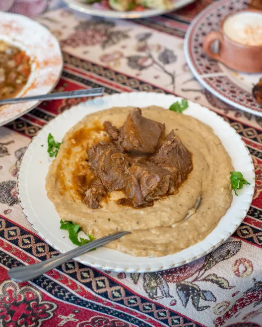 Αν είσαι μυημένος στην αρμένικη κουζίνα δεν θα δυσκολευτείς να διαλέξεις. Αν όμως δεν είσαι, θα σου πω τα sos που αξίζει να δοκιμάσεις, αν και ό,τι βγαίνει από την κουζίνα είναι εξαιρετικό. Η βασιλική σούπα είναι μια ιδιαίτερη κρεατόσουπα που αποτελείται από κάτι πολύ μικρά πλιγουρένια γιουβαρλάκια, ρεβίθια, κομματάκια από μοσχαρίσιο κρέας, δυόσμο, λεμόνι και σκόρδο.