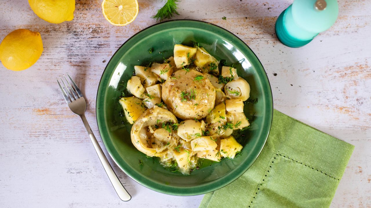 - 6–8 αγκινάρες φρέσκες (ή 500 γρ. καθαρισμένες κατεψυγμένες)