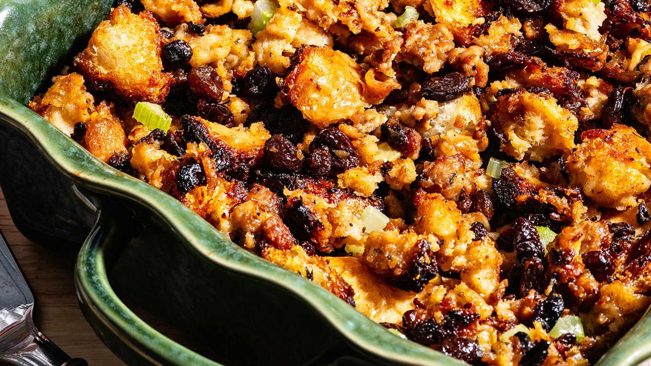 - Χαμηλώνουμε τη φωτιά σε μέτρια, ρίχνουμε στο τηγάνι το κρεμμύδι, το σέλινο, τις σταφίδες, το βούτυρο, το θυμάρι, την κανέλα, το αλάτι, το πιπέρι και σοτάρουμε, ανακατεύοντας περιστασιακά, μέχρι να αρχίσουν να μαλακώνουν το κρεμμύδι και το σέλινο, για περίπου 10 λεπτά. Μεταφέρετε το μείγμα στο μπολ με το λουκάνικο.