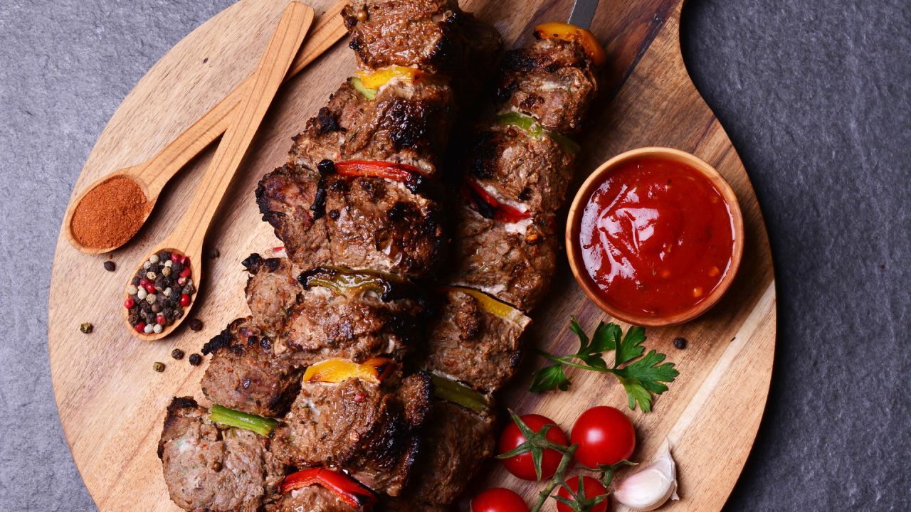 - Όταν είναι έτοιμο, σκουπίζουμε ελαφρά τα κομμάτια με χαρτί κουζίνας, τα αλατίζουμε και τα περνάμε σε μεταλλικές βέργες, εναλλάξ με τα κομμάτια από τις πιπεριές.