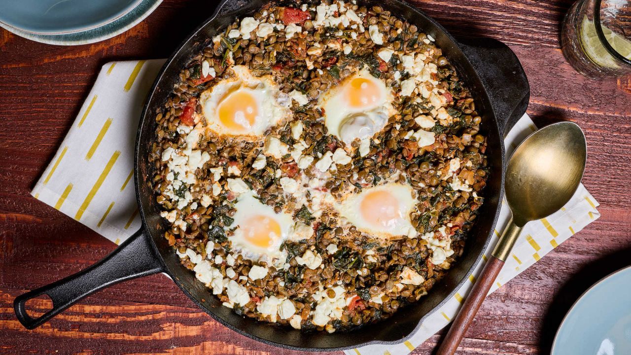 - Για τα αυγά με φακές, ντομάτα, σπανάκι και φέτα ξεπλένουμε τις φακές κάτω από τρεχούμενο νερό και αφαιρούμε τυχόν πέτρες. Τις βάζουμε σε μέτρια κατσαρόλα και τις καλύπτουμε με κρύο νερό.