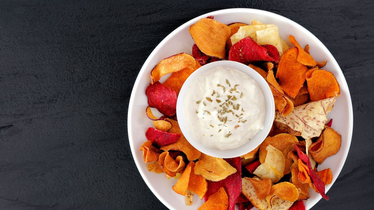 - Για τα τσιπς λαχανικών στον φούρνο με ντιπ γιαουρτιού προθερμαίνουμε τον φούρνο στους 170°C και στρώνουμε με αντικολλητικό χαρτί ψησίματος τρία ρηχά ταψιά.