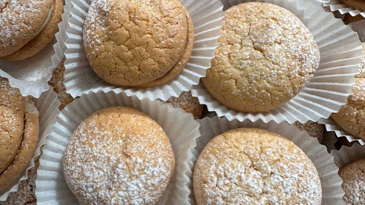 - Μόλις τα αμυγδαλωτά έρθουν σε θερμοκρασία δωματίου τα κολλάμε μεταξύ τους ανά δύο, βάζοντας ενδιάμεσα την κρέμα.