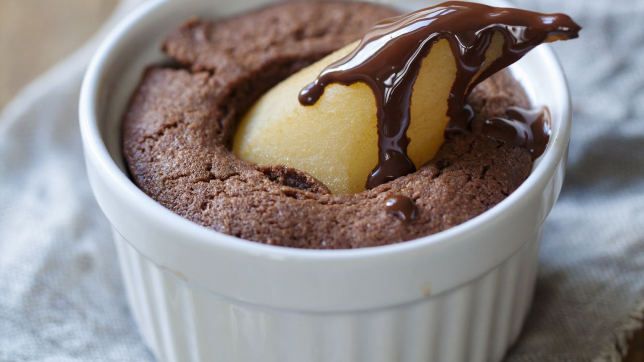 - Γεμίζουμε τα αχλάδια με 1 κομματάκι σοκολάτας, βάζοντάς το στο κενό που δημιουργήσαμε στο εσωτερικό τους και τοποθετούμε σε κάθε ραμεκέν από ένα αχλάδι.