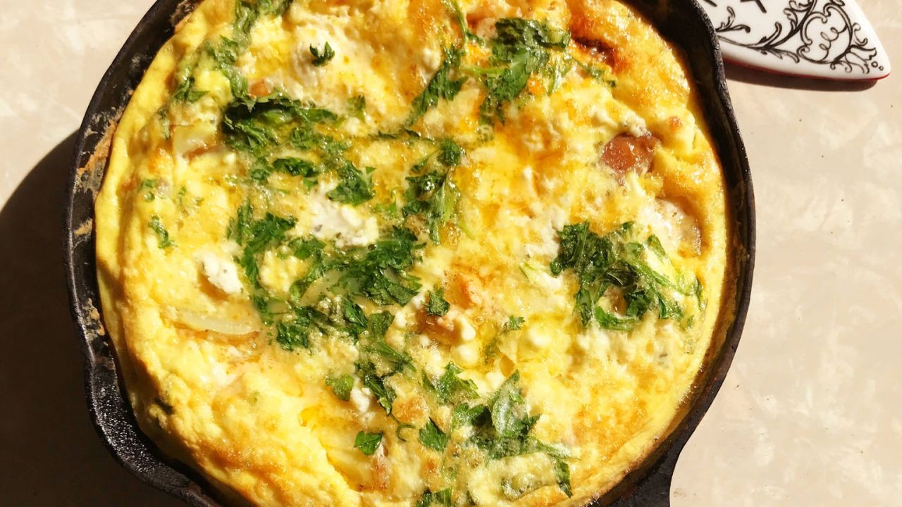 - Σερβίρουμε τη φριτάτα στο τραπέζι μαζί με το τηγάνι, πασπαλίζοντας με το πράσινο μέρος των κρεμμυδιών, επιπλέον μαϊντανό ψιλοκομμένο και φυλλαράκια από θυμάρι.