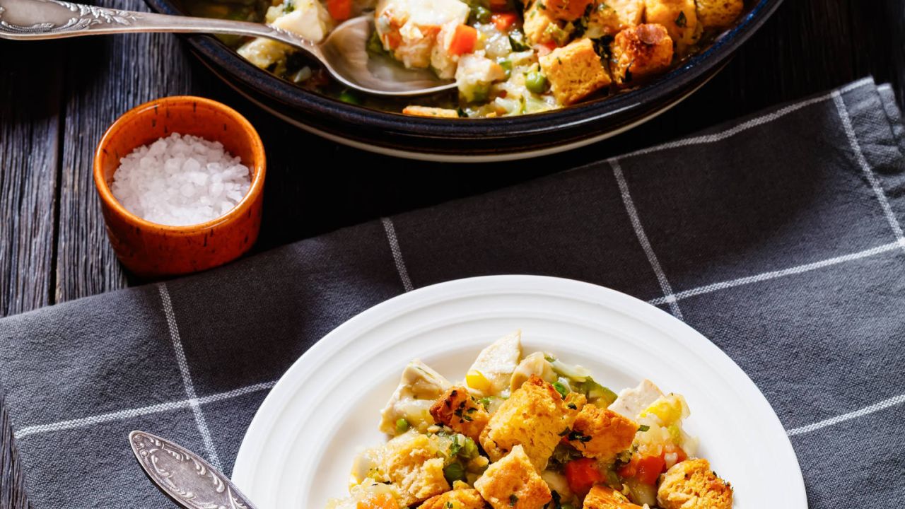 - Αφήνουμε τη γέμιση να κρυώσει και πριν τη βάλουμε στη γαλοπούλα, προσθέτουμε τα κυβάκια του ψωμιού και ανακατεύουμε.