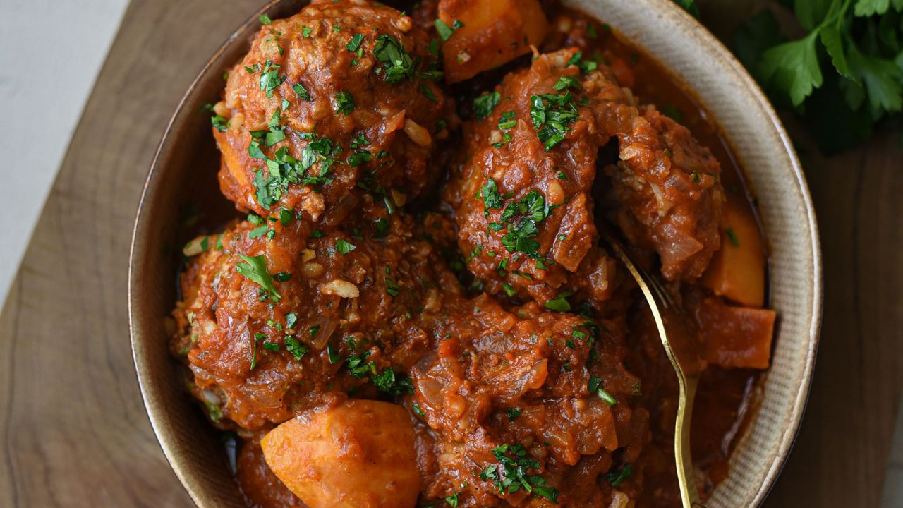 - Για τα κοκκινιστά γιουβαρλάκια με γλυκοπατάτα ρίχνουμε σε ένα μπολ όλα τα υλικά για τα γιουβαρλάκια και ανακατεύουμε καλά, να ομογενοποιηθούν.