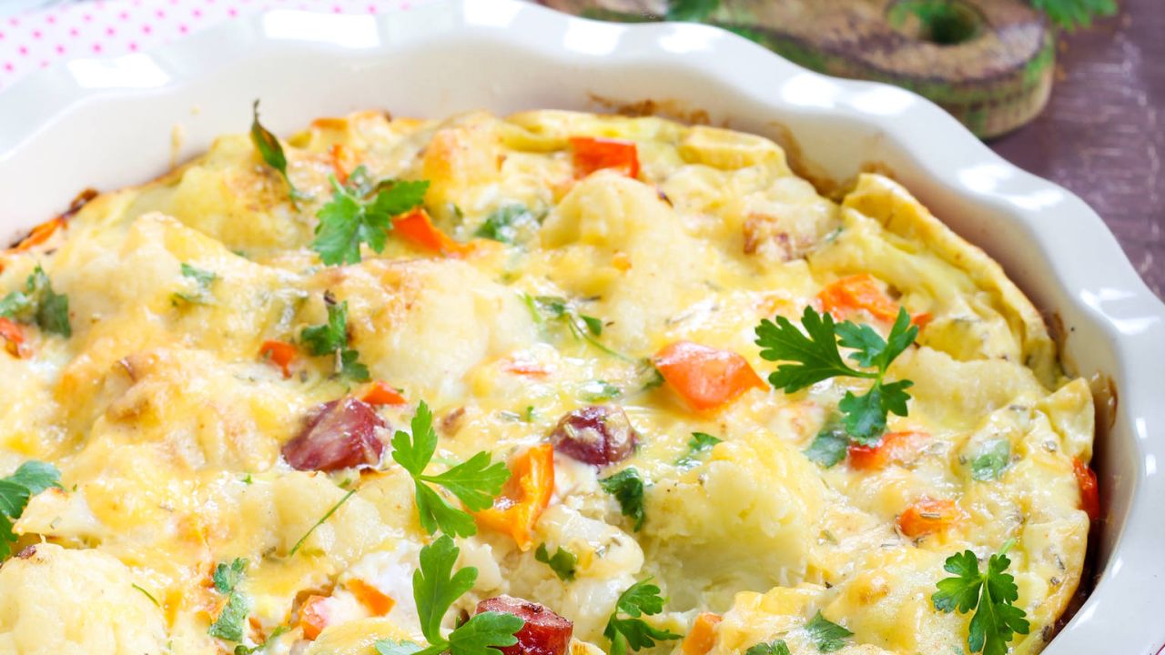 - Σκορπίζουμε από πάνω ομοιόμορφα το υπόλοιπο βούτυρο, το βρασμένο κουνουπίδι και το μπέικον.