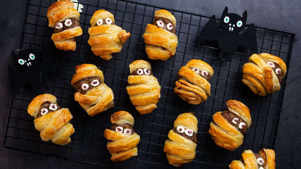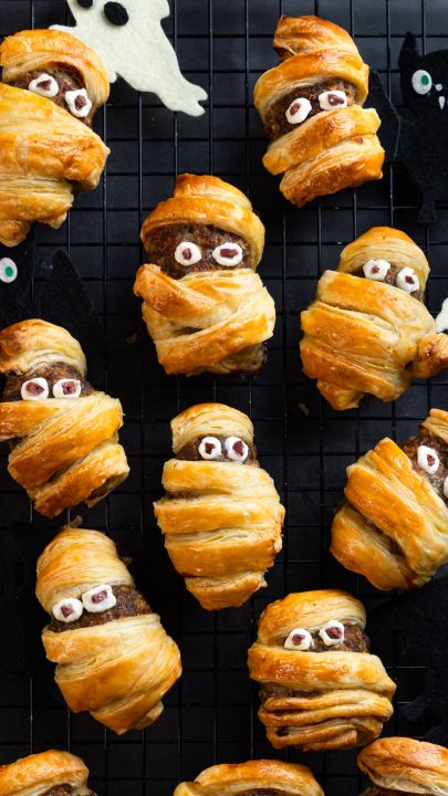 - Τυλίγουμε κάθε κεφτεδάκι με 1-2 λωρίδες σφολιάτας, αφήνοντας μικρά κενά σαν «ταινίες μούμιας», αφήνοντας ένα σημείο κενό για τα μάτια.