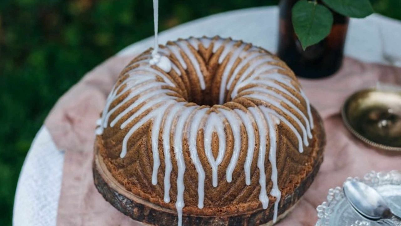 - Αδειάζουμε το μείγμα σε μια αλευροβουτυρωμένη φόρμα για κέικ. Ψήνουμε στον φούρνο για 45-50 λεπτά. Για να βεβαιωθούμε ότι είναι έτοιμο, τρυπάμε με ένα μαχαίρι το κέικ μέχρι το μαχαίρι να βγει καθαρό.