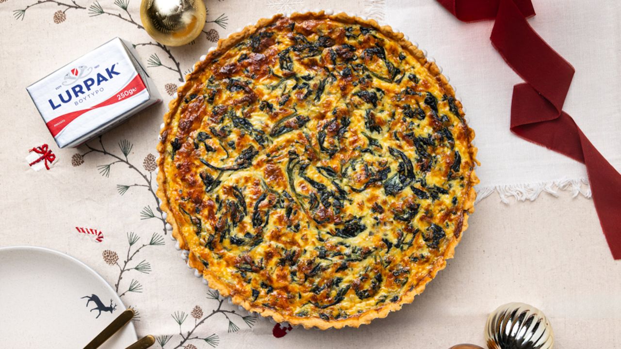6. Ανοίγουμε τη ζύμη σε στρογγυλό δίσκο και την απλώνουμε σε μια ταρτιέρα διαμέτρου 24-26 εκ., φροντίζοντας να καλύψουμε τον πάτο και τα πλαϊνά της. Την τρυπάμε με πιρούνι και με την ανάστροφη ενός μαχαιριού κόβουμε όση ζύμη περισσεύει.