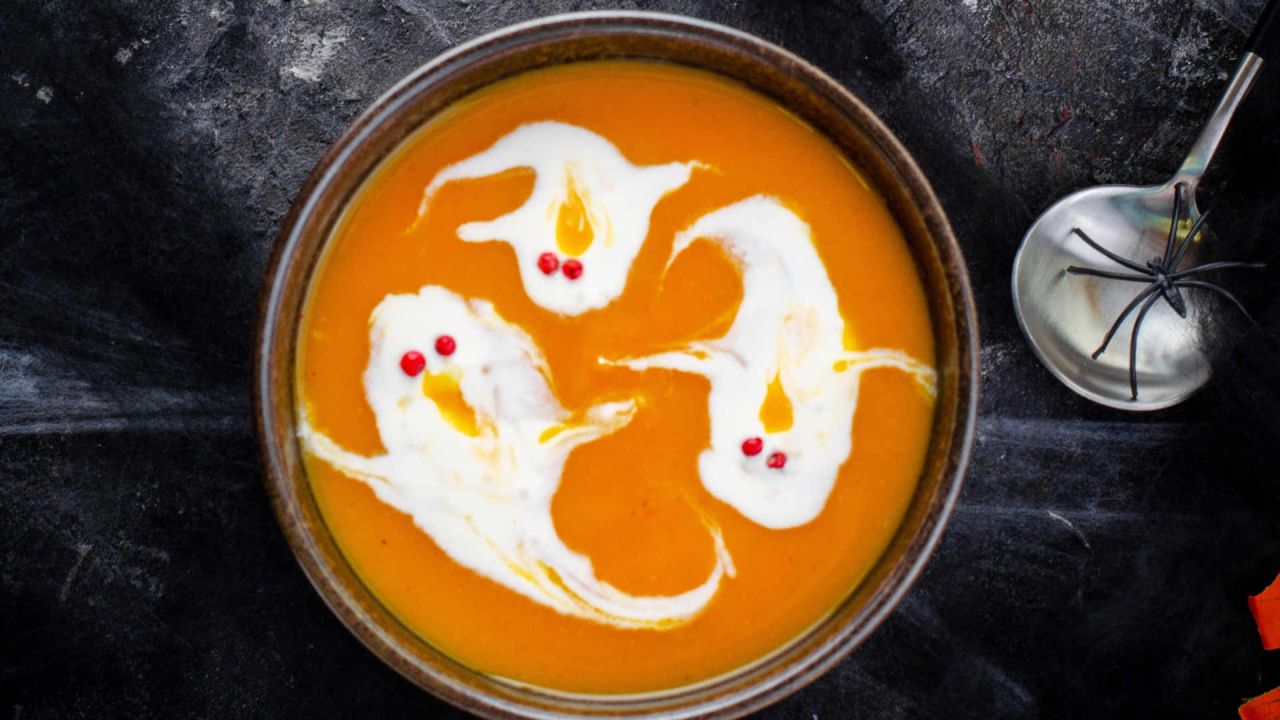 2. Εναλλακτικά παίρνουμε με ένα κουτάλι της σούπας κρέμα και την αφήνουμε απαλά στην επιφάνεια της σούπας. Την τραβάμε με τη μύτη του κουταλιού ώστε να μοιάζει με φαντασματάκι. Για καλύτερο αποτέλεσμα τοποθετούμε δυο κόκκους πιπεριών για μάτια…