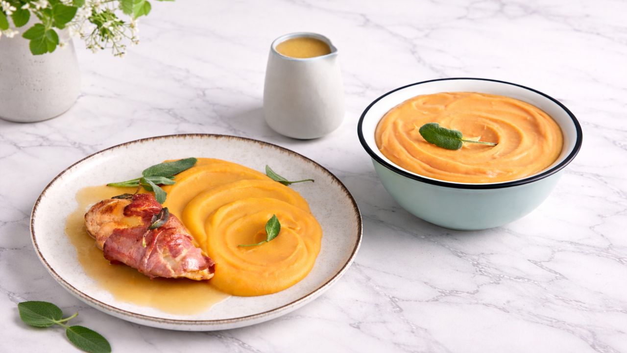 - Ετοιμάζουμε τον Πουρέ Πατάτας με Γλυκοπατάτα & Καρότο ΓΙΩΤΗΣ σύμφωνα με τις οδηγίες του κουτιού και σερβίρουμε γαρνίροντας με το κοτόπουλο.