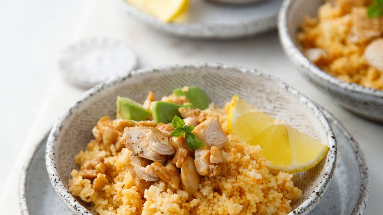 - Σερβίρουμε το κουσκούς σε πιατέλα, βάζουμε από πάνω το κοτόπουλο και πασπαλίζουμε με ψιλοκομμένο μαϊντανό, ξύσμα λεμονιού και φρεσκοτριμμένο πιπέρι.