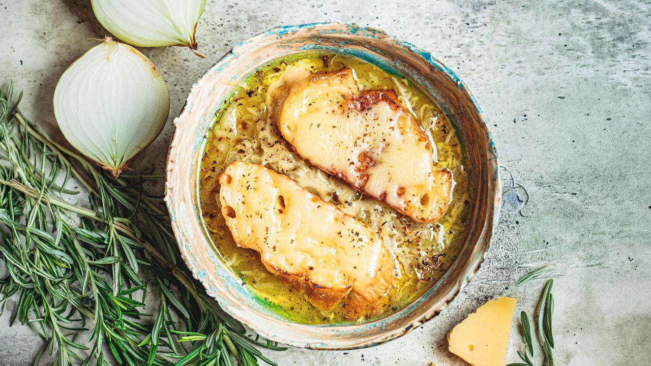 5. Μοιράζουμε τη σούπα σε πυρίμαχα μπολ, προσθέτουμε από πάνω τις φέτες τσουρεκιού και το τυρί.