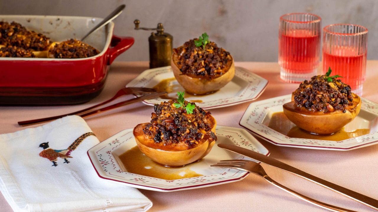 Εδώ τα κυδώνια τα γεμίζουμε με μια αρωματική γέμιση από κιμά μοσχαρίσιο, σταφίδες και κουκουνάρι.