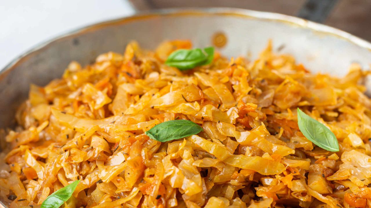 - Χαμηλώνουμε τη φωτιά, προσθέτουμε το κύμινο και την πάπρικα, αλατοπιπερώνουμε, σκεπάζουμε και αφήνουμε να σιγομαγειρευτεί για 10 λεπτά. Το λάχανο πρέπει να μαλακώσει αλλά να κρατά ακόμα την υφή του. Ανακατεύουμε, δοκιμάζουμε και διορθώνουμε αν χρειάζεται το αλατοπίπερο.