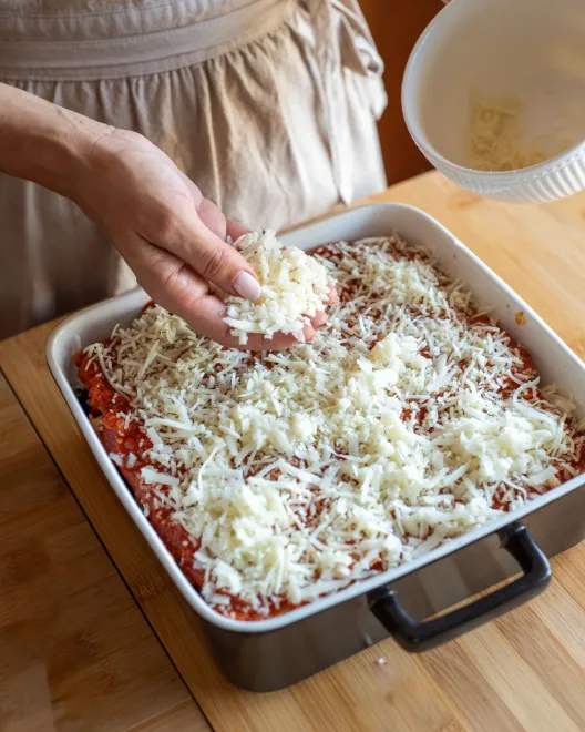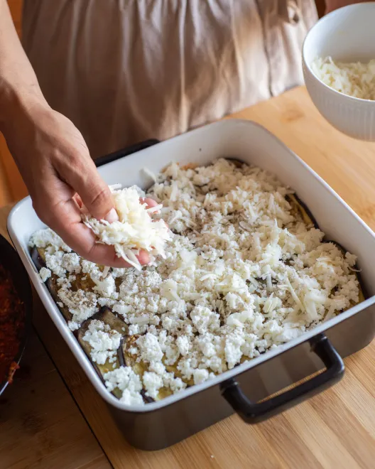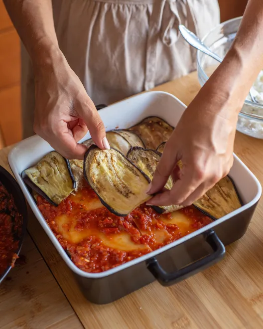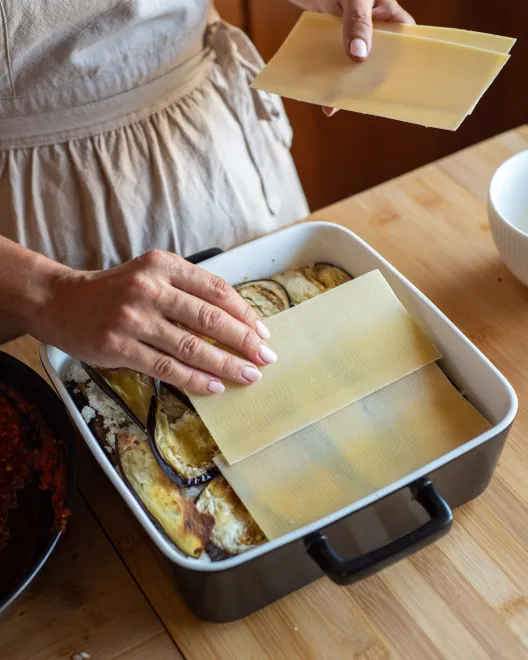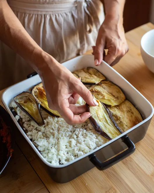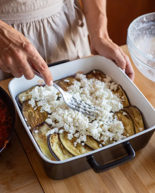 Ακολουθούμε τις οδηγίες για τις στρώσεις στο πυρίμαχο σκεύος, έτσι ώστε να κολλήσουν ωραία τα υλικά και οι γεύσεις μεταξύ τους.