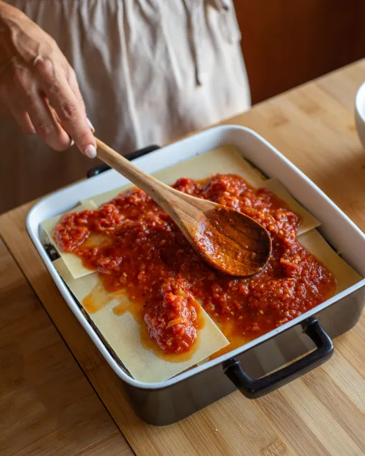 Η σάλτσα μας θέλουμε να βγει ζουμερή και όχι πολύ δεμένη, για να δώσει υγρασία στα λαζάνια. Αν βγει πολύ πηχτή, μπορούμε να την αραιώσουμε με λίγο ζεστό νερό.