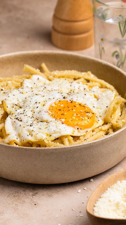 - Μοιράζουμε τα μακαρόνια σε πιάτα, βάζουμε από πάνω 1 ή 2 αυγά, πασπαλίζουμε με την υπόλοιπη μυζήθρα και μπόλικο, φρεσκοτριμμένο πιπέρι και σερβίρουμε.