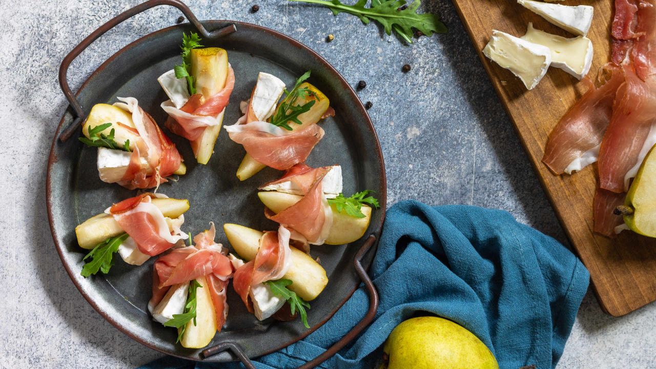 - Για να φτιάξουμε το μεζεδάκι με αχλάδια, μπρι και προσούτο πλένουμε τα αχλάδια και - χωρίς να αφαιρέσουμε τη φλούδα τους - τα κόβουμε στη μέση και βγάζουμε τα κουκούτσια και το κοτσάνι.