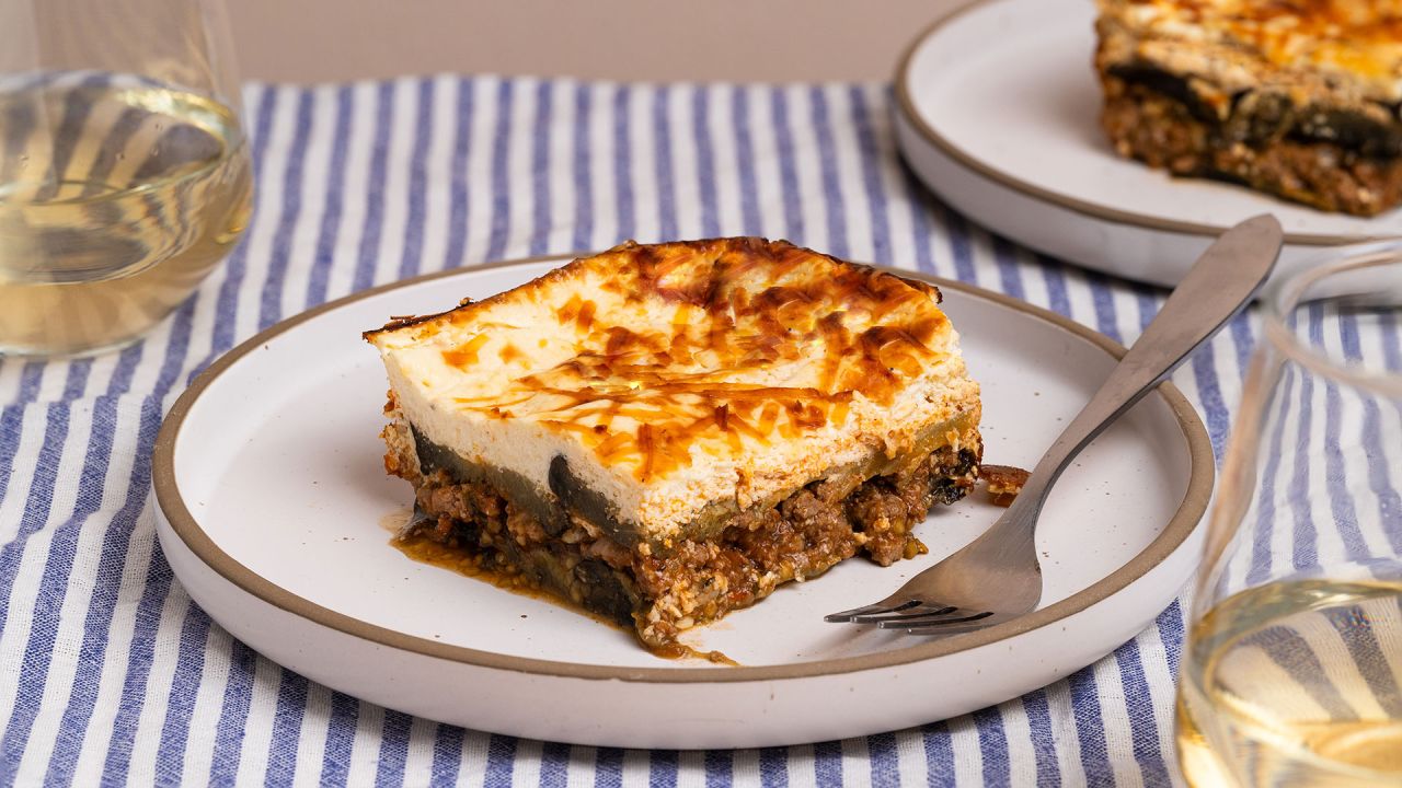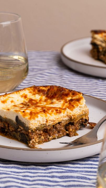 - Σερβίρουμε τον μουσακά χλιαρό, κόβοντας σε κομμάτια.