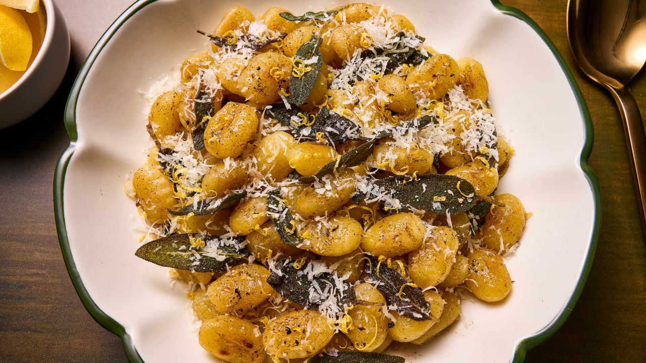 - Αποσύρουμε από τη φωτιά και περιχύνουμε με το καμένο βούτυρο και το φασκόμηλο τα νιόκι. Πασπαλίζουμε με αλάτι, πιπέρι, ξύσμα λεμονιού, παρμεζάνα και σερβίρουμε τα νιόκι ζεστά.