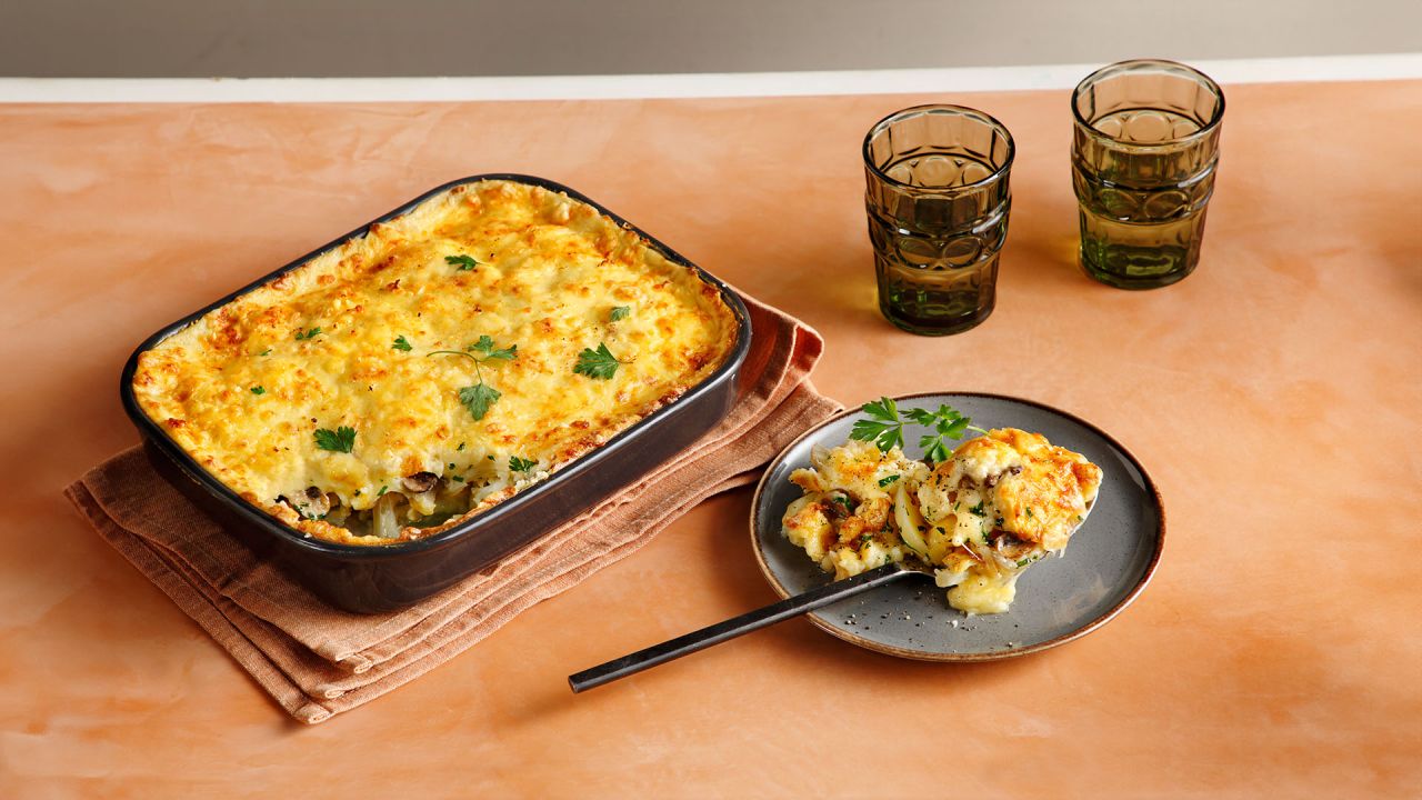 - Ψήνουμε στον φούρνο στους 190°C για 55 λεπτά, μέχρι να χρυσαφίσει η μπεσαμέλ.