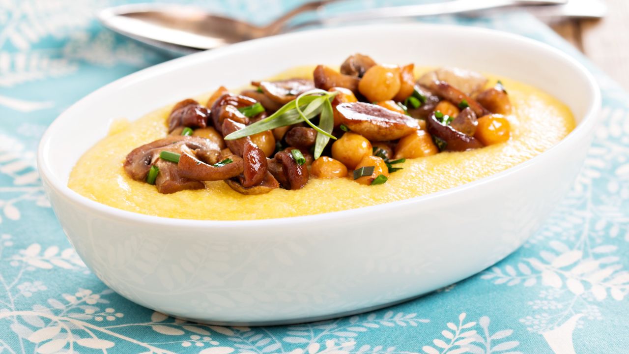9. Σερβίρετε τον πουρέ σε πιατέλα και από πάνω βάζουμε τα ρεβίθια και τα μανιτάρια.