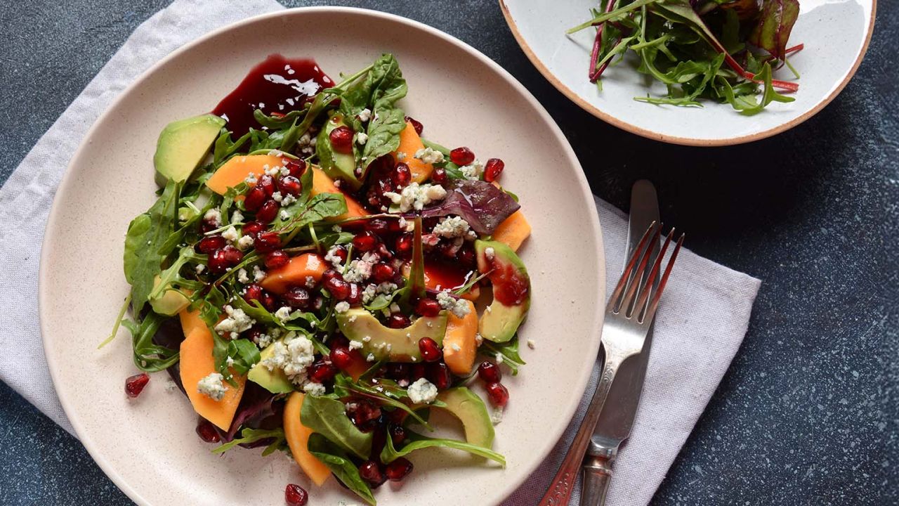 Το ζουμερό ρόδι και ο γλυκός λωτός δένουν αρμονικά με την ένταση του μπλε τυριού και τη βελούδινη υφή του αβοκάντο, ενώ η vinaigrette βαλσάμικου ολοκληρώνει το πιάτο με βάθος και χαρακτήρα. Μια σαλάτα ιδανική τόσο ως ελαφρύ γεύμα όσο και ως εντυπωσιακό συνοδευτικό σε ένα επίσημο τραπέζι.