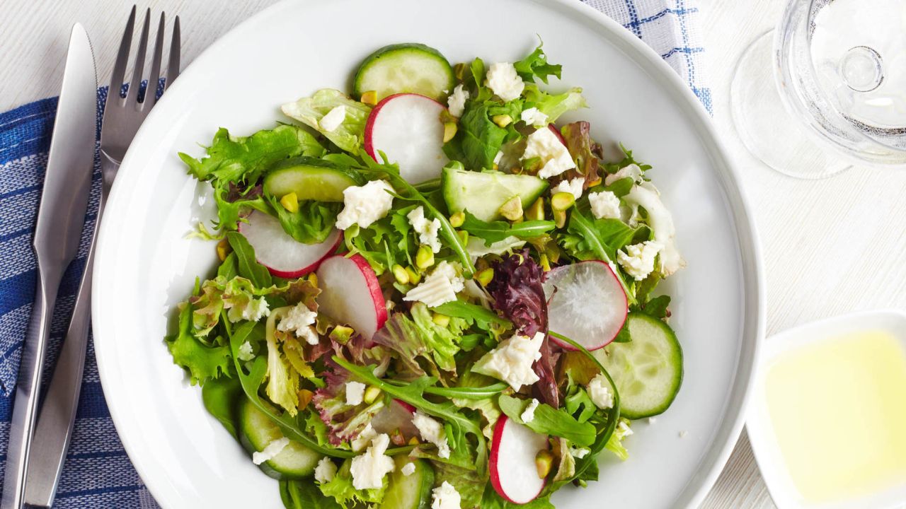 - Για την πράσινη σαλάτα με βινεγκρέτ τοποθετούμε τα λαχανικά σε μια σαλατιέρα ή πιατέλα σερβιρίσματος.