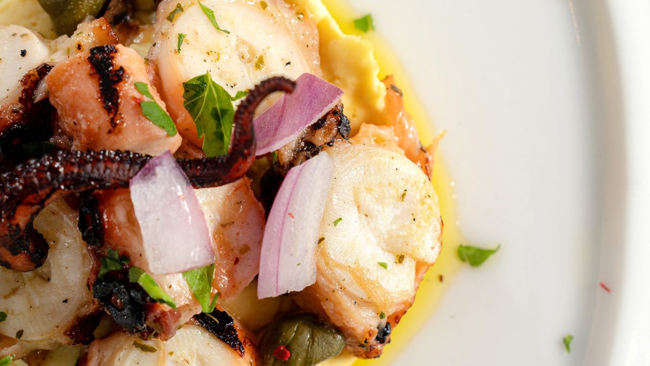 2. Σερβίρουμε τη φάβα ζεστή και από πάνω βάζουμε μπουκιές από το χταπόδι. Γαρνίρουμε με ροδέλες κρεμμυδιού και λίγο επιπλέον ελαιόλαδο.