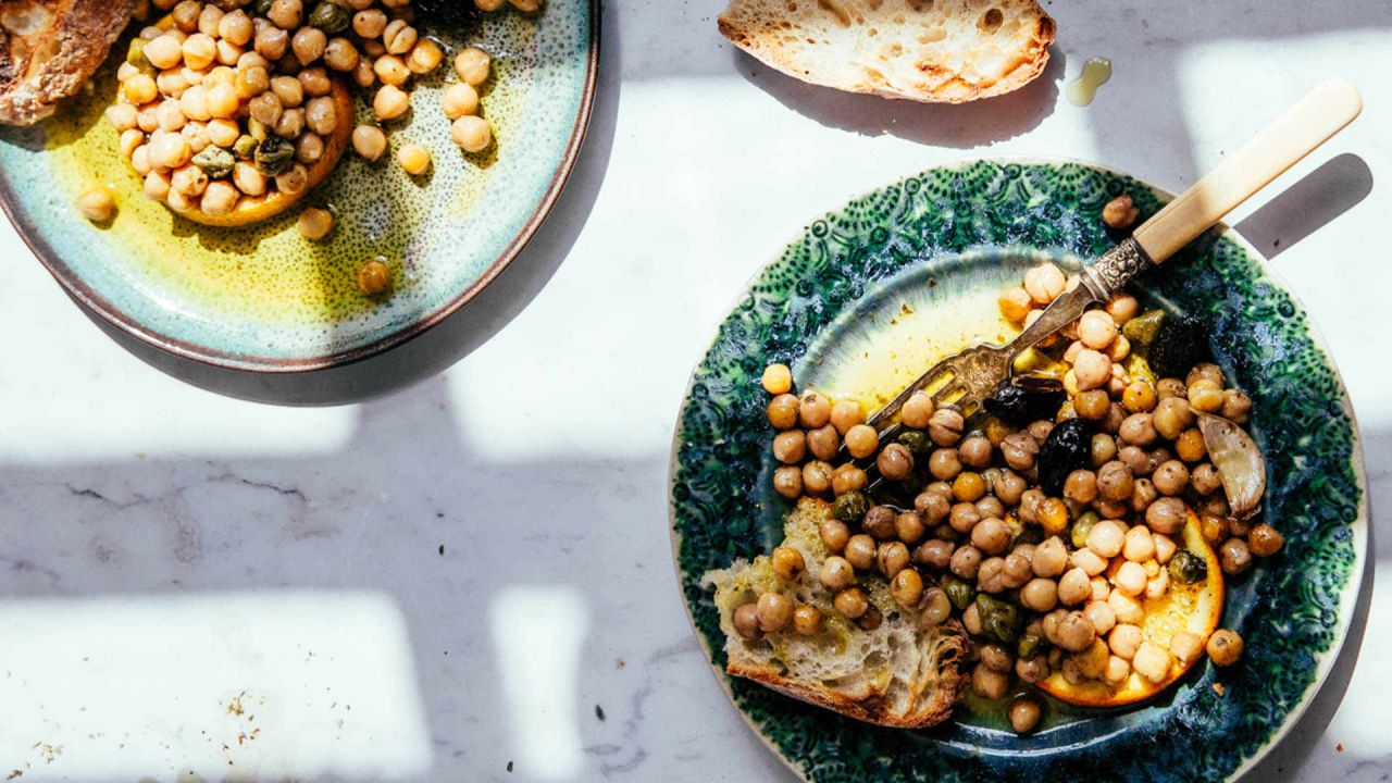 - Βάζουμε το μισό πορτοκάλι σε πυρίμαχο σκεύος, καλύπτουμε με τα ρεβίθια και απλώνουμε από πάνω το υπόλοιπο πορτοκάλι.