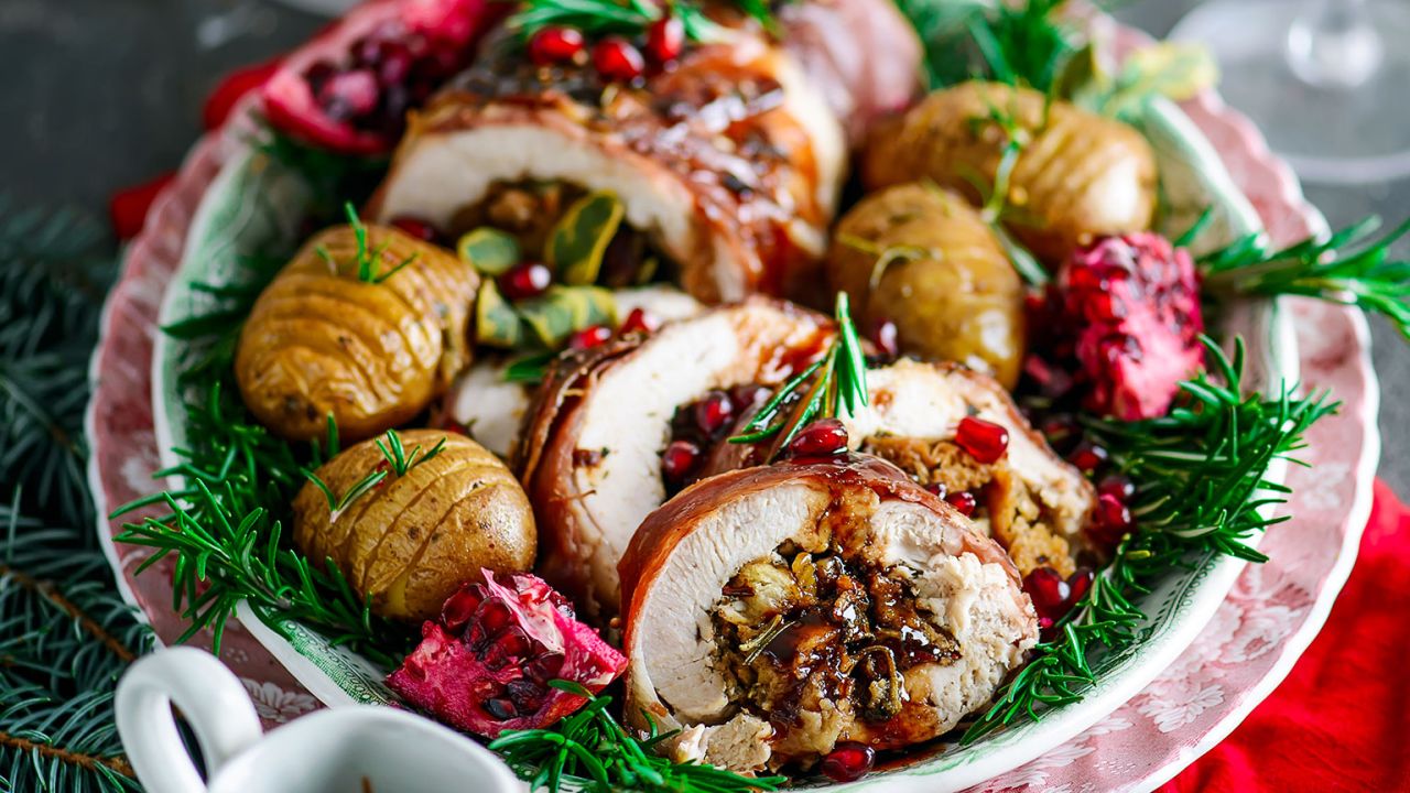 - Σερβίρουμε το ρολό σε φέτες, συνοδεύοντας με τις πατάτες φούρνου και διακοσμώντας με κλωνάρια δεντρολίβανου και ρόδι.