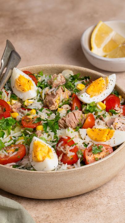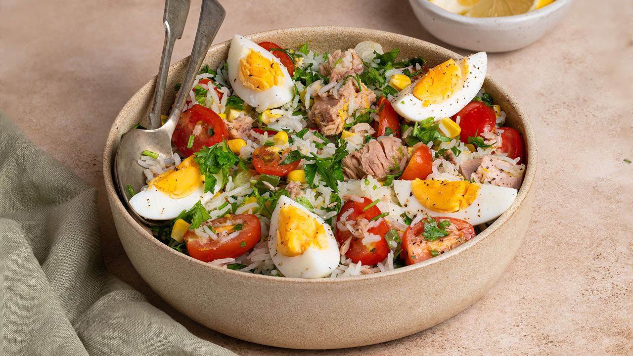 - Για τη ρυζοσαλάτα με τόνο, αυγά και λαχανικά πρώτα ξεπλένουμε και βράζουμε το ρύζι σε άφθονο αλατισμένο νερό για 15 λεπτά περίπου, μέχρι να μαγειρευτεί χωρίς να παραβράσει.