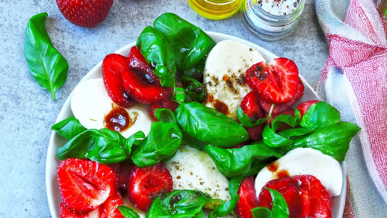 1. Για τη σαλάτα caprese με burrata και φρέσκες φράουλες, πρώτα φροντίζουμε οι φράουλες να είναι καλά στεγνωμένες.