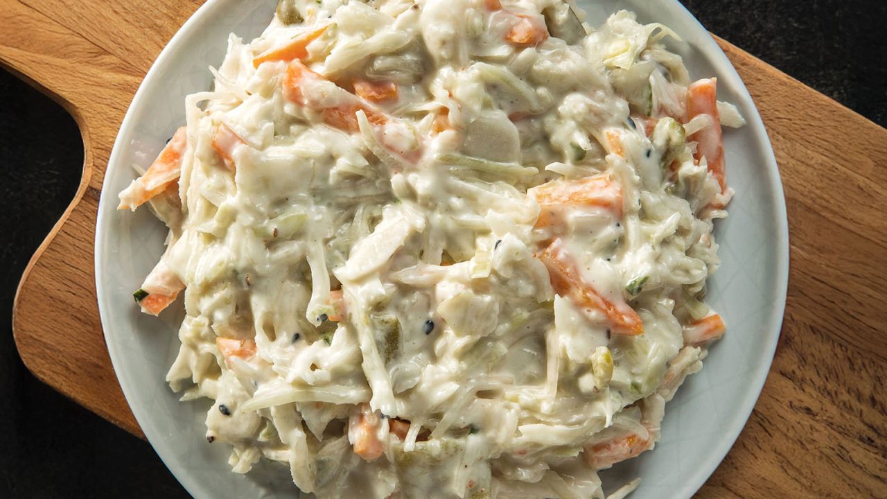 1. Για τη σαλάτα coleslaw βάζουμε σε μεγάλο μπολ όλα τα λαχανικά, αλατίζουμε και ανακατεύουμε.